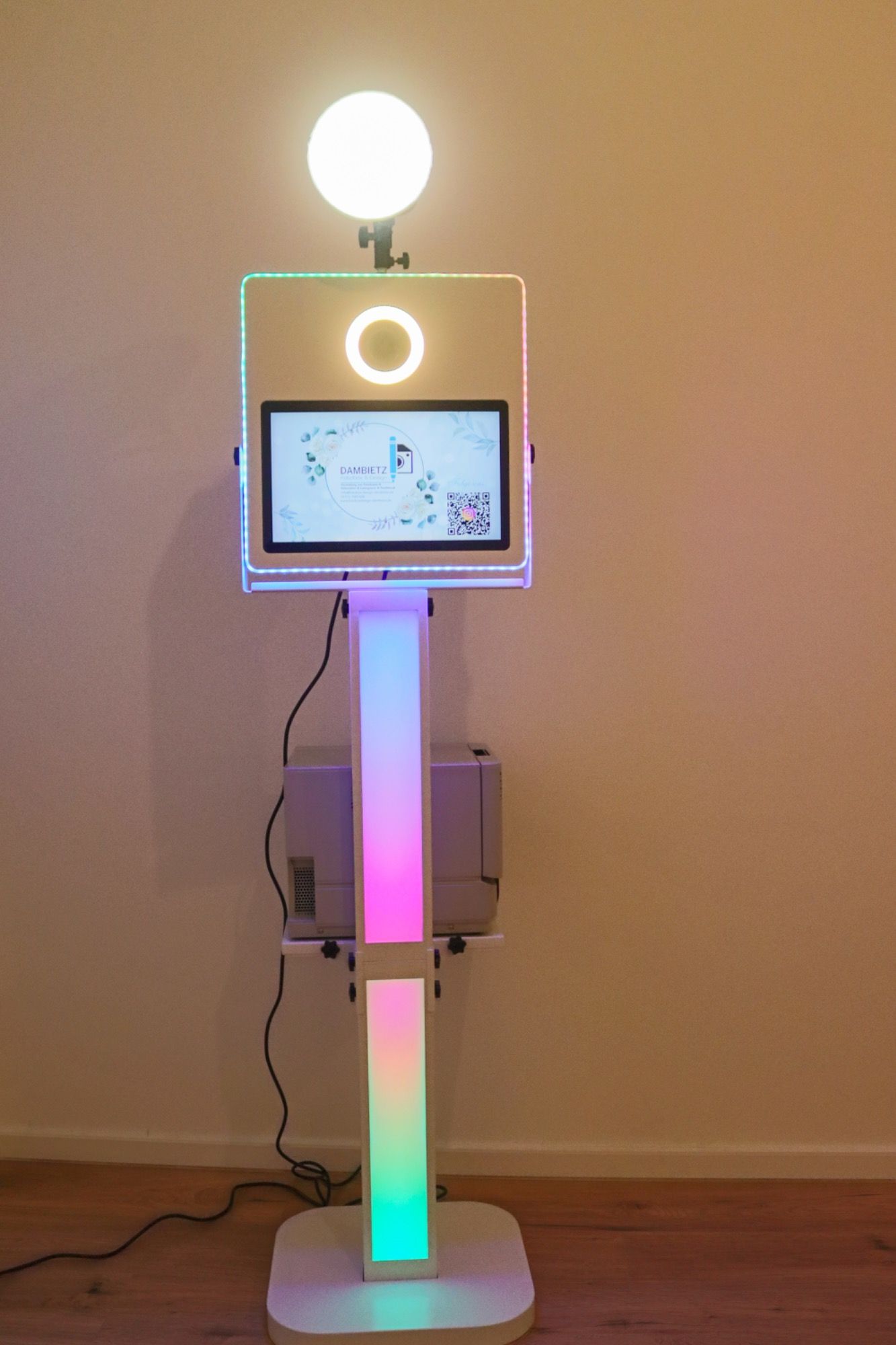 Der Fußständer der Fotobox ist beleuchtet und kann passend zu Ihrer Eventbeleuchtung angepasst werden.